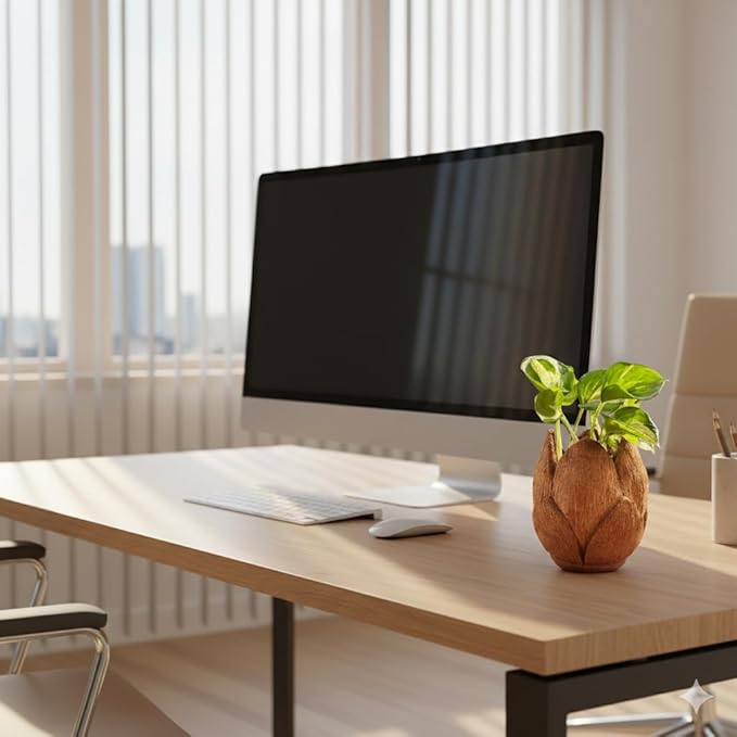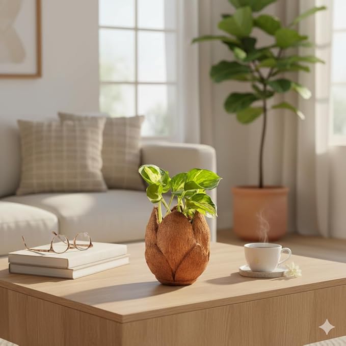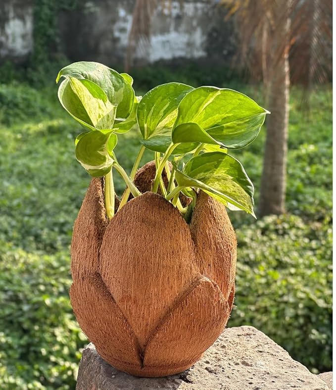 • UNIQUE 3-STEP LOTUS DESIGN: A masterpiece of Kerala craftsmanship. This planter is intricately shaped to resemble a blooming lotus flower with three distinct layers (“steps”) of coconut husk. It acts as a stunning centerpiece for your living room, balcony, or office desk, blending art with nature.