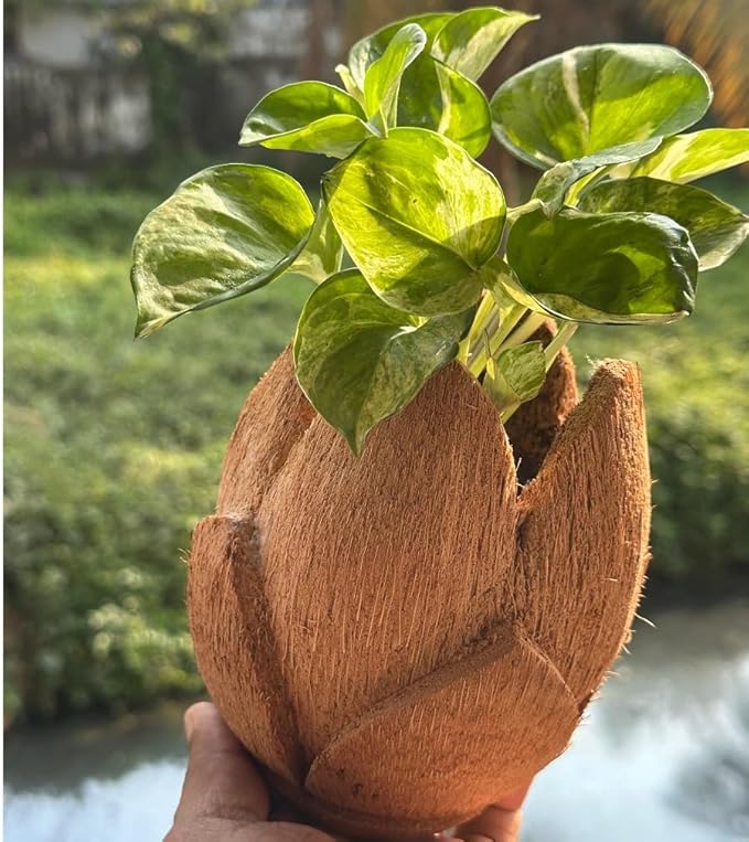 • MOISTURE-RETAINING & SELF-COOLING: The thick coconut layers act as a natural sponge, holding moisture and releasing it slowly to the plant. The husk also provides thermal insulation, keeping plant roots cool during the hot Indian summers.